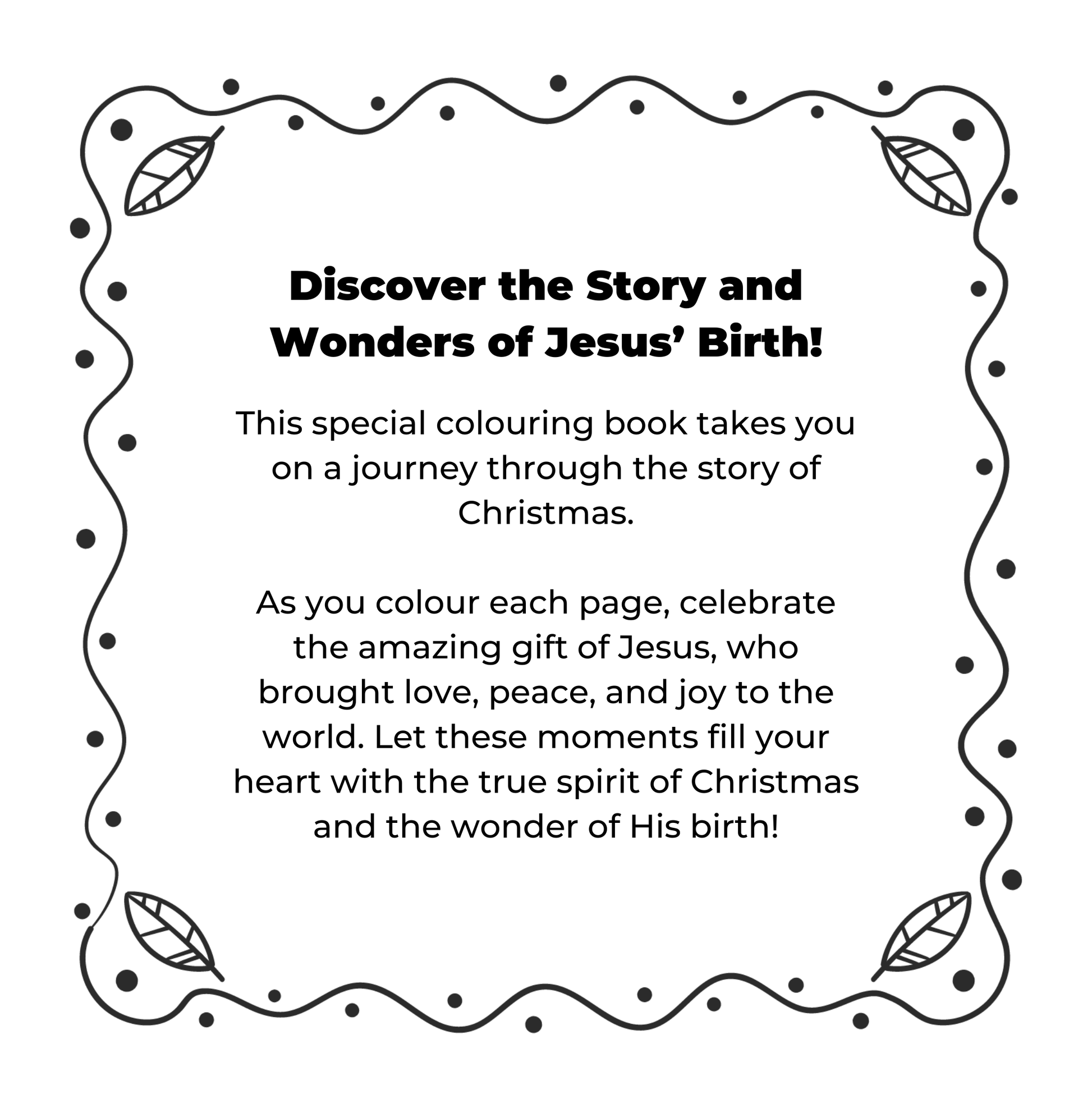This beautifully illustrated colouring book invites children to experience the wonder of Jesus’ birth in a fun, interactive, and faith-filled way. From the angel’s announcement to Mary, to Joseph’s journey to Bethlehem, to the joyful arrival of baby Jesus, each page captures the heart of the Nativity story with simple scenes perfect for young hands to colour.